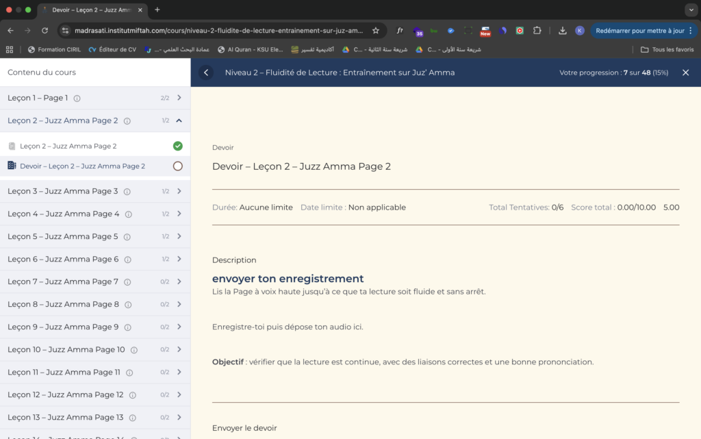 Chaque leçon possède sa propre section « Devoirs ». Il est important que l’enfant dépose son enregistrement dans le devoir correspondant à la leçon travaillée. Cela permet au professeur de corriger efficacement et d’assurer un suivi précis de la progression.