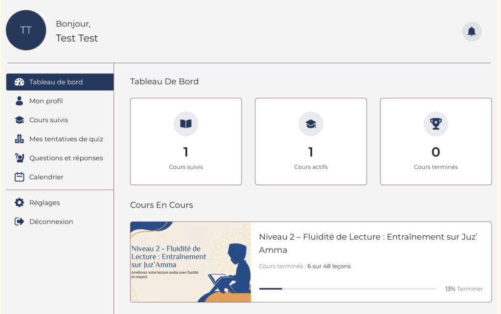 Une fois connecté, votre enfant accède à son Tableau de Bord personnel. Il y retrouve ses cours actifs (par exemple : « Juz’ 3 »), sa progression leçon par leçon, et les devoirs à rendre.